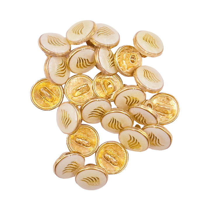 - These round shape downhole loop kurta/shirt buttons with wings pattern design on enamel colour surface finish with lamination on top with a shiny gold base are crafted from a metal alloy for the strongest & most durable shirt buttons, have a shank back attachment & have a smooth surface finish. Comes in a set of 24pcs with a size of 10mm (16L) available in 2 different colors- Shiny Gold with White and Shiny Gold with Black.