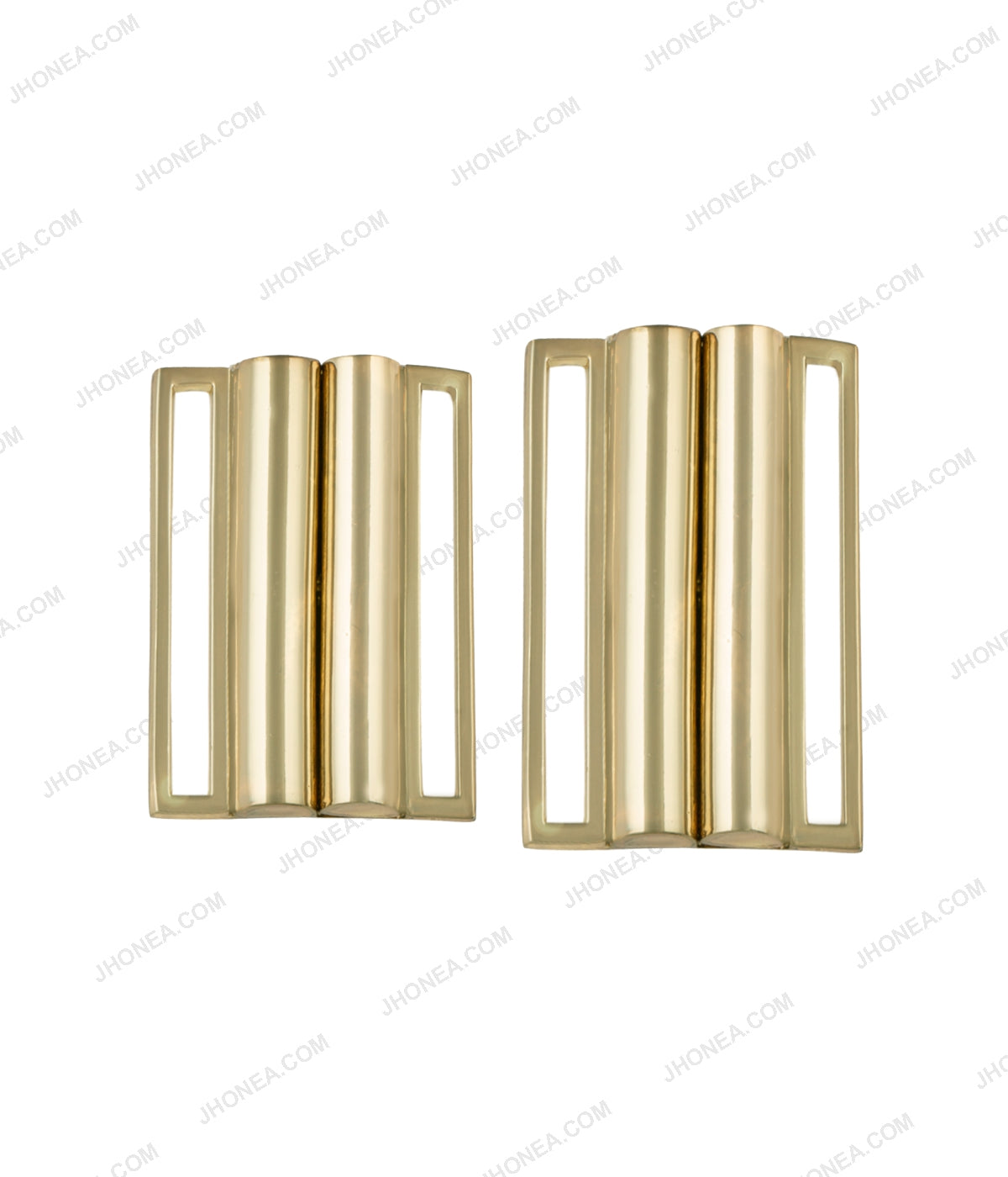 - A shiny gold rectangle shape clasp buckle with a smooth surface finish is an excellent choice for those who love bling in their outfit. Classic Designed 2 part closure clasp belt buckle in shiny gold color is used for fastening two ends such as straps or a belt in which a buckle is attached to one end & is fitted or coupled to the other. Two different size available the bar inside is 50mm wide and 70mm from both sides so you can insert any type of cloth material belt/elastic of this size to create the belt.