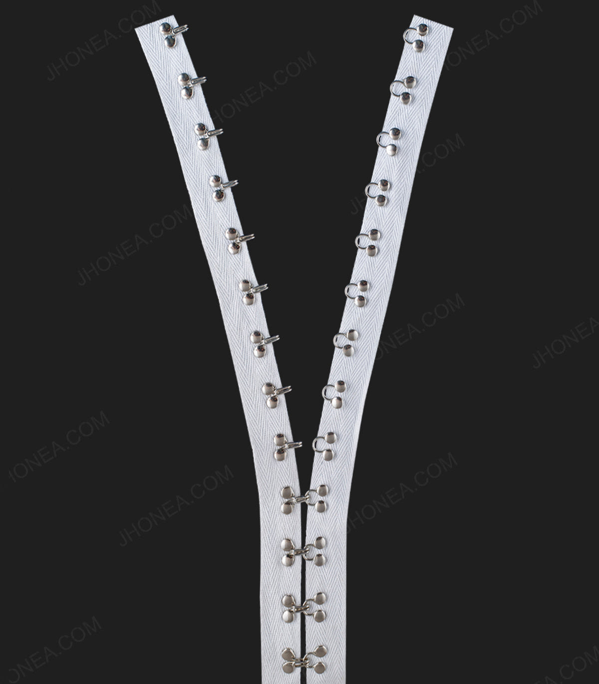 - Riveted hook & eye lace is available in white color with 4.5cm width. This white cotton lace is made of riveted brass hook & eye which can be easily opened & closed. You can enclose your clothes' edge between them for a super clean finish. It is hand sewed very neatly & in delicacy with fine workmanship.