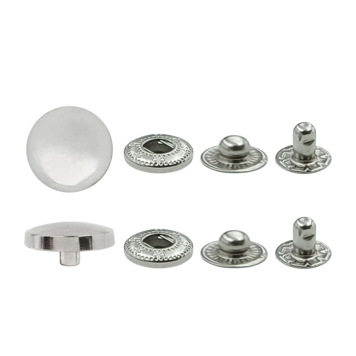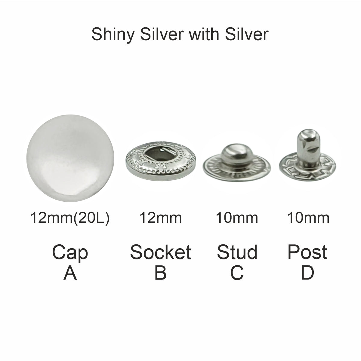 Comes in 12 sets - each snap button includes 4 parts: Cap (A), Socket (B), Stud (C), and Post/Base (D).1. Cap (Top Left in each set):• The top part of this snap button features a smooth, round, shiny silver cap with a domed shape that creates a sleek, polished, and modern finish. This shiny silver cap comes with a three-part structure (socket, stud, and post/base), all in matching shiny silver, ensuring both functionality and aesthetic appeal.2. Socket:• Attaches to the cap and provides the female side of the snap. Receives the stud from the opposite part to create the snapping function.3. Stud:• The male component that fits firmly into the socket. Provides a reliable closure mechanism, preventing accidental opening and ensuring long-lasting fastening strength.4. Post/Base:• The bottom part that connects with the stud to provide structural support. Anchors the snap button securely to the fabric, leather, or material, guaranteeing durability even under frequent wear.