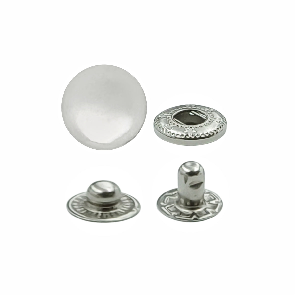 - Featuring a chrome finished round-shaped snap button, this variety of metal snap fasteners also known as 4-part snap buttons, press buttons, press studs, press fasteners, poppers, snaps, or tich buttons offers a smooth, round, flat surface. These 4-part snap fasteners consist of a pair of interlocking discs made from durable metal. Available in size 12mm (20L).