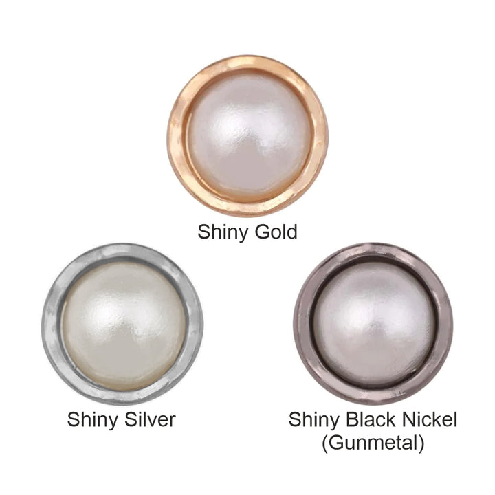 - They are made of good quality alloy metal with great finishing & gives a protruding effect on the surface & they are durable & long-lasting. This metal pearl button is available in 3 different finishes Shiny Gold, Shiny Silver & Shiny Black Nickel (Gunmetal) in size 10mm (16L), get such designer pearl buttons for shirts & kurtas on Jhonea.
